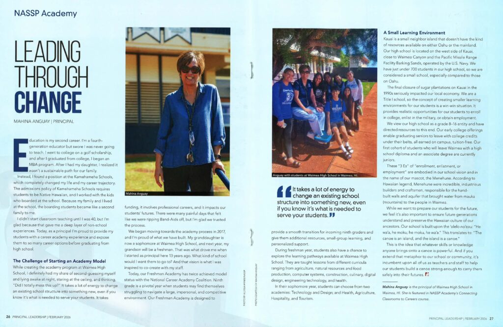 “I didn’t start classroom teaching until I was 40, but I’m glad because that gave me a deep layer of non-school experiences,” Anguay said. “Today, as a principal I’m proud to provide my students with a career academy experience and expose them to so many career options before graduating from high school.”