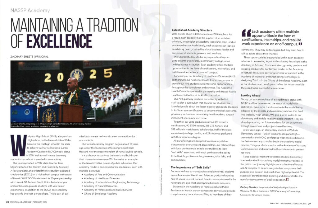 Similar successes are happening at Waipahu High School where Sheets is principal. The school offers six academies, which include multiple pathways. It was the first high school in the state to achieve “wall-to-wall” National Career Academy Coalition model status in 2020 under now-Superintendent Keith Hayashi.